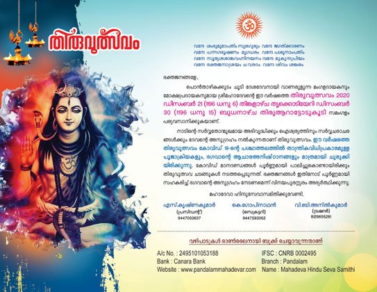 ധനു മാസത്തിലെ തിരുവാതിരക്ക് ആറാട്ട് നടക്കുന്ന രീതിയില് പത്തു ദിവസമാണ് കൊടിയേറിയുള്ള തിരുവുല്സവം. തിരുവുല്സവത്തോടനുബന്ധിച്ച് അന്പോലി, ശിവപുരാണ പാരായണം, വിവിധ കലാപരിപാടികള് എന്നിവ നട 7, 8, 9 ദിവസങ്ങളില് സേവയും, ഒന്പതാം ഉല്സവദിനത്തില് പൂരക്കാഴ്ചയും കുടമാറ്റവും ഉല്സവത്തിന്റെ പ്രധാന ഇനങ്ങളാണ്. കടക്കാട് വടക്ക് ആറാട്ട്കടവില്നിന്നും ആരംഭിക്കുന്ന ആറാട്ട് ഘോഷയാത്ര വന് ജനാവലിയുടെയും ഗജവീരന്മാരുടെയും താലപ്പൊലികളുടെയും അകമ്പടികളോടെ ക്ഷേത്രത്തിലെത്തി ഉല്സവചടങ്ങുകള് അവസാനിക്കുന്നു.